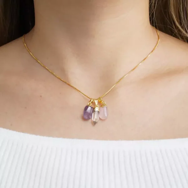 Met de stenen die de beroemde Gouden Driehoek vormen: Amethist, Rozenkwarts & Bergkristal. Ze komen uit dezelfde familie, de kwartsfamilie, en zijn als neven en nichten als ze bij elkaar komen, ze zijn sterker.