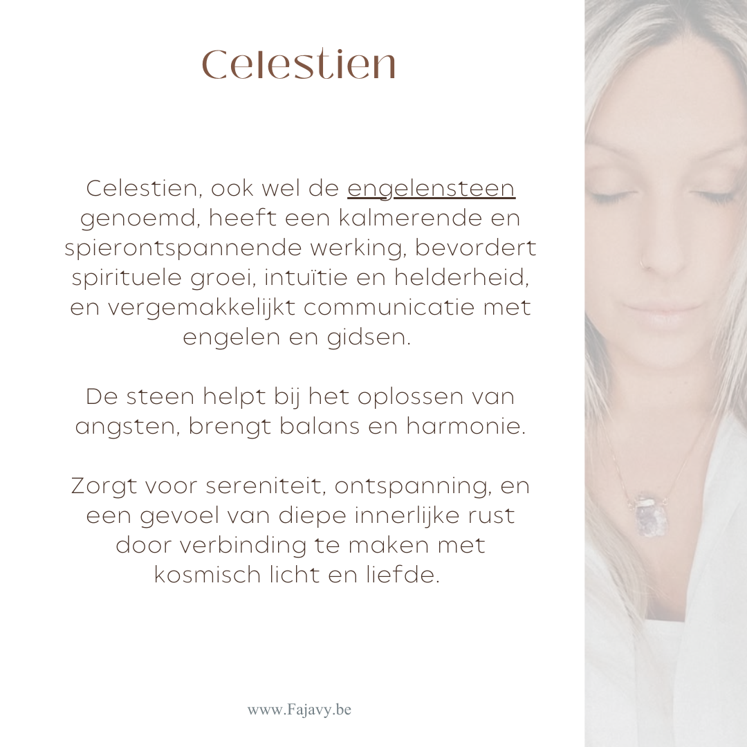 Celestien, ook wel de engelensteen genoemd, heeft een kalmerende en spierontspannende werking, bevordert spirituele groei, intuïtie en helderheid, en vergemakkelijkt communicatie met engelen en gidsen.
