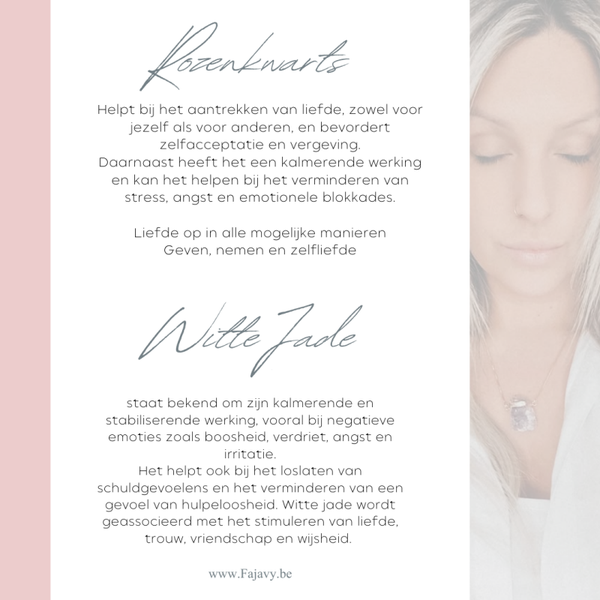 Het helpt ook bij het loslaten van schuldgevoelens en het verminderen van een gevoel van hulpeloosheid. Witte jade wordt geassocieerd met het stimuleren van liefde, trouw, vriendschap en wijsheid.