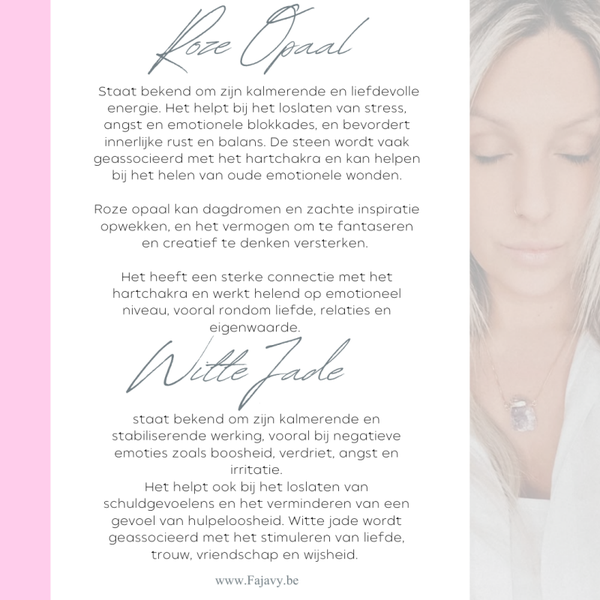 Staat bekend om zijn kalmerende en liefdevolle energie. Het helpt bij het loslaten van stress, angst en emotionele blokkades, en bevordert innerlijke rust en balans. De steen wordt vaak geassocieerd met het hartchakra en kan helpen bij het helen van oude emotionele wonden.