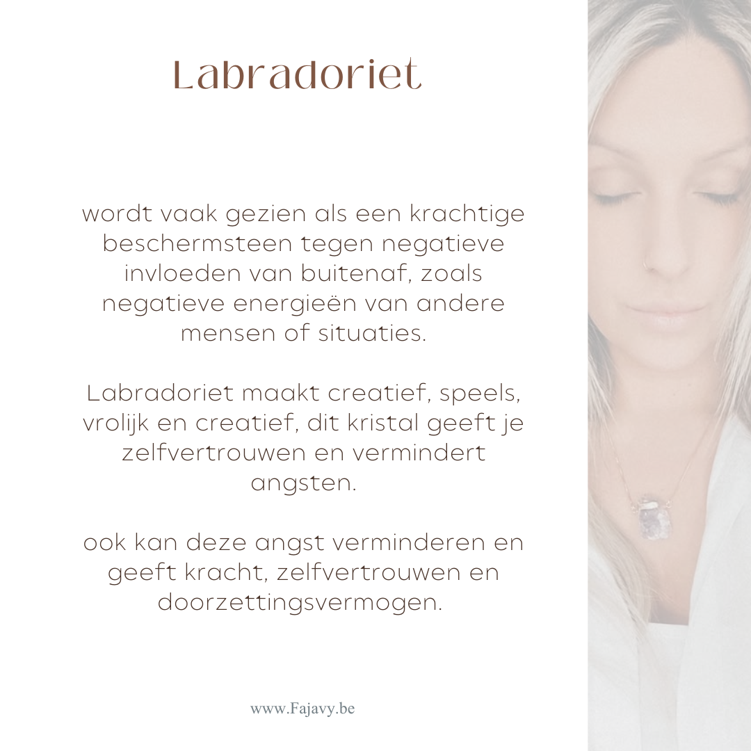 Labradoriet maakt creatief, speels, vrolijk en creatief, dit kristal geeft je zelfvertrouwen en vermindert angsten.